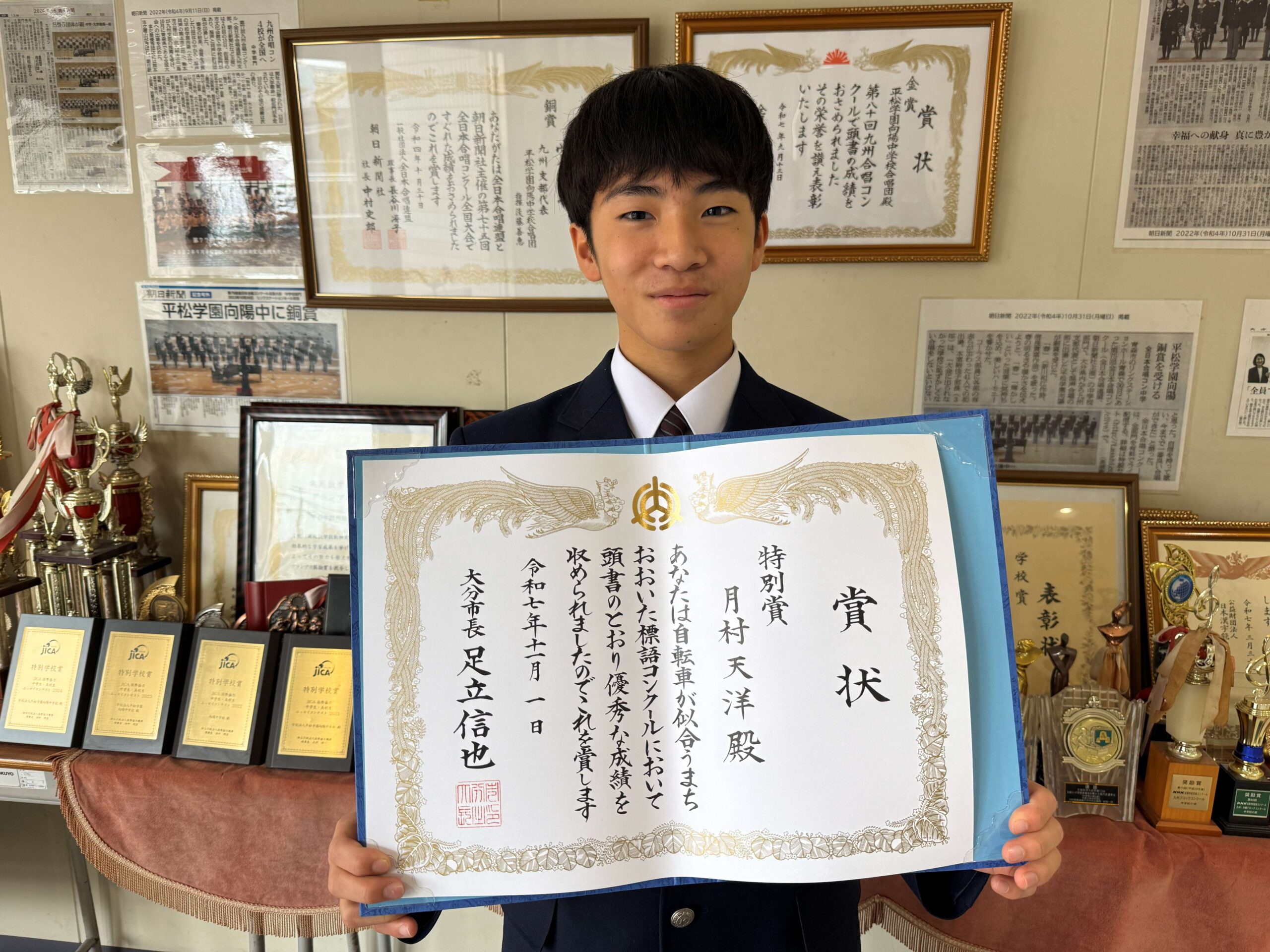 環境にやさしく健康づくりにも役立つ自転車の良さを再認識し、利用促進とルールやマナーの理解を深めてもらうことを目的として大分市が募集した「自転車が似合うまち おおいた」がテーマの標語コンクールにおいて、本校1年生の月村天洋さんが862作品の中から特別賞を受賞しました。