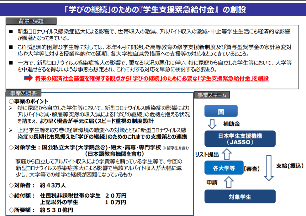 新型コロナウイルス感染症拡大による影響で、世帯収入・アルバイト収入の大幅な減少により、学生生活にも経済的な影響が顕著となっている状況の中で、大学等での修学の継続が困難になっている学生等 が修学をあきらめることがないよう、現金を支給する事業が創設されました。