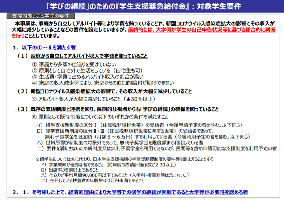 「学びの継続」のための『学生支援緊急給付金』について