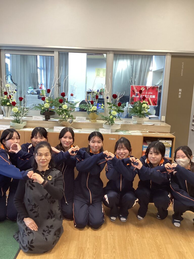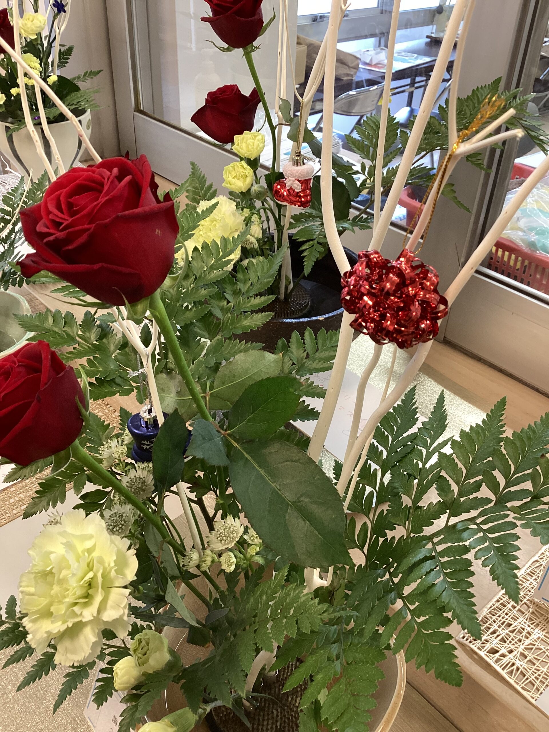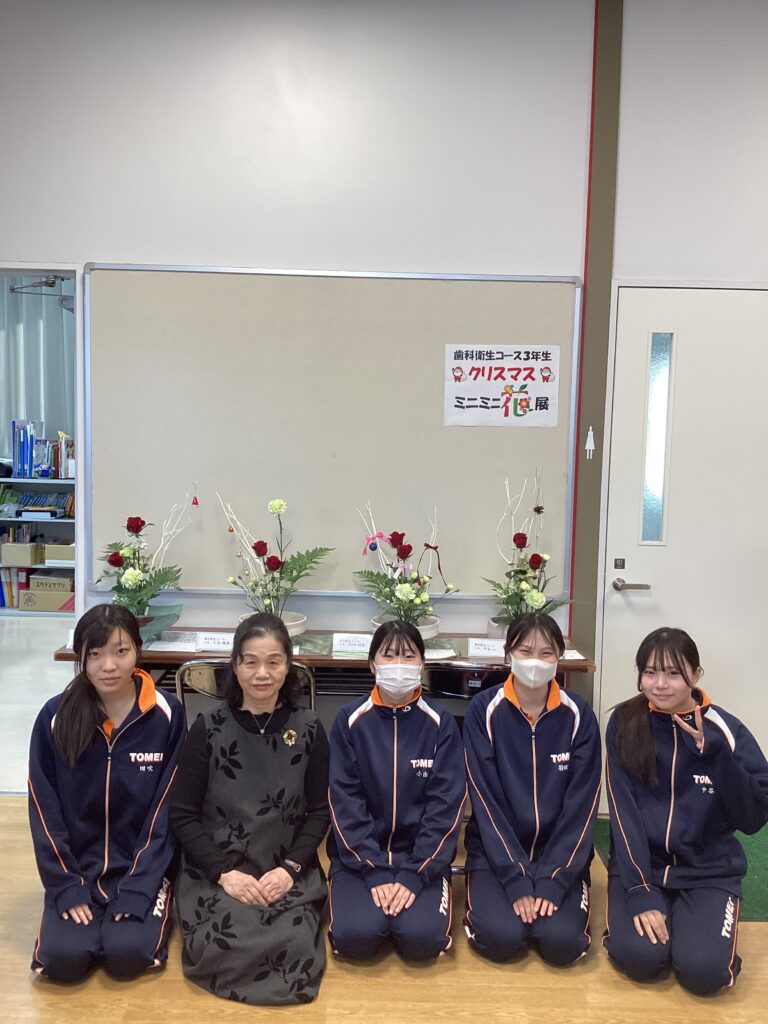 12月7日土曜日から12日火曜日、歯科衛生コース3年生が、自分たちの教室のある第一体育館別館校舎の玄関で、「クリスマス ミニミニ花展」を開催した。 生徒たちは、日頃のおけいこの成果をおもいおもいの作品に表現。日頃ご指導いただいている足立智子先生のサポートを受けて、クリスマスらしい、真っ赤なバラと白い枝が印象的な素敵な花展が実現し、多くの生徒や職員が足を止めて、作品に見入っていた。