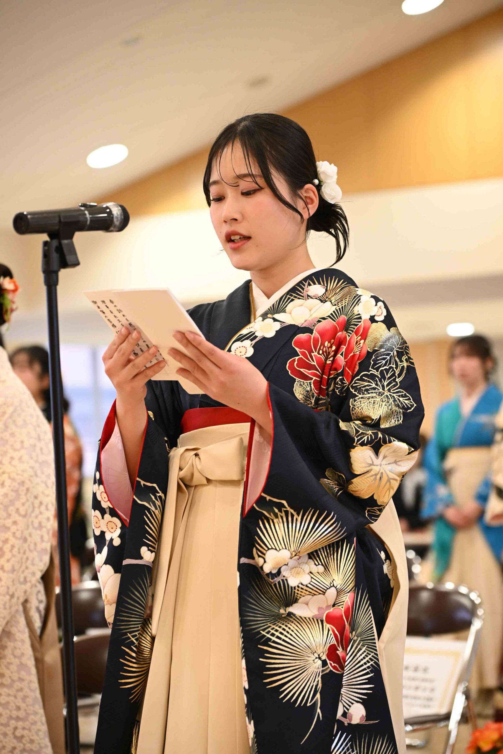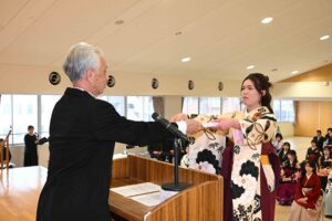 式典は終始、厳粛な空気の中で進行し、卒業証書の授与ならびに各賞の表彰が行われた。卒業生代表による答辞では先生や切磋琢磨した友人、そして献身的に支えてくれた家族への深い謝意が述べられた。実習などの苦楽を共にした日々を振り返り、涙を浮かべる卒業生の姿もみられ、会場は大きな感動に包まれた。