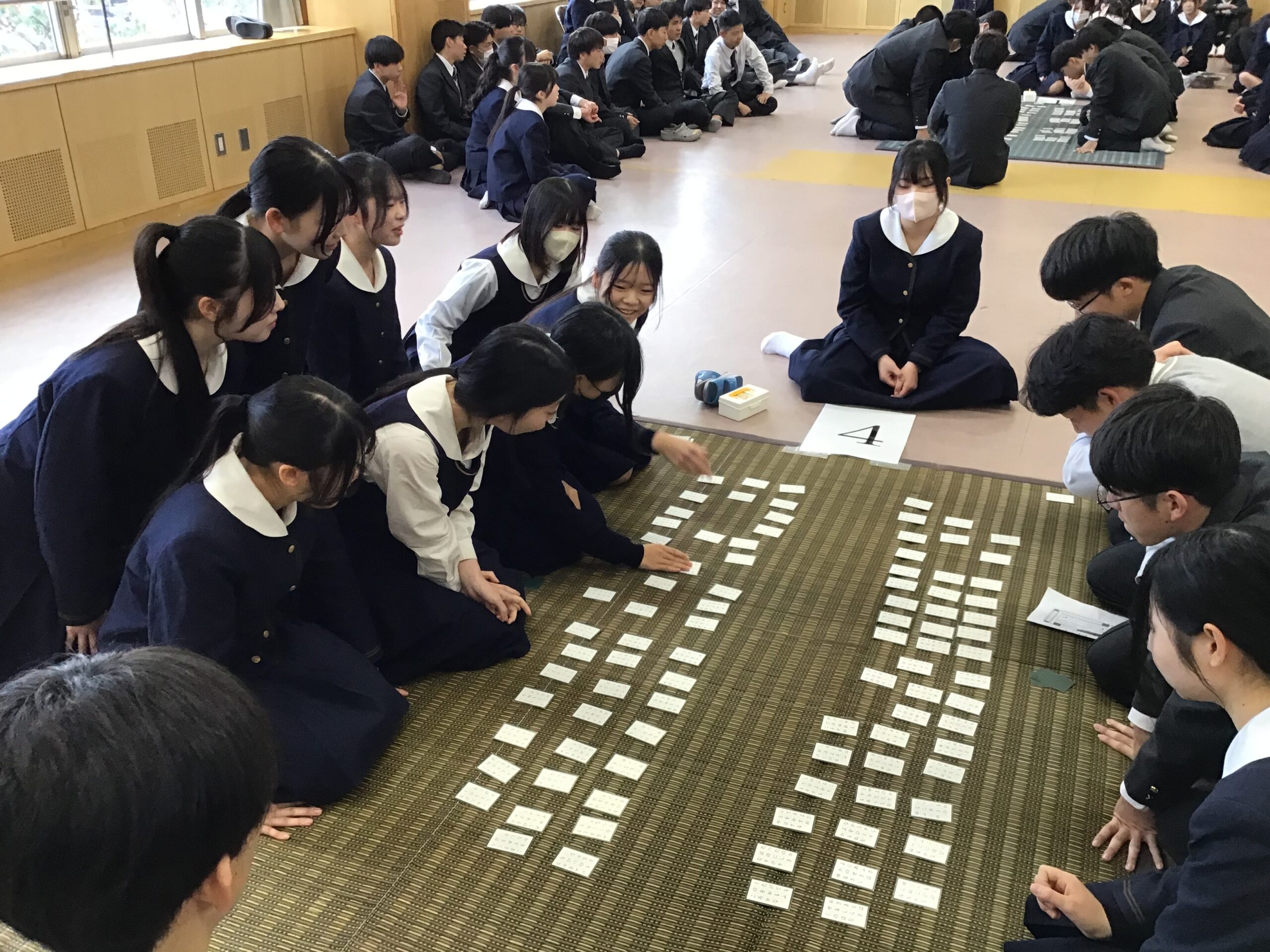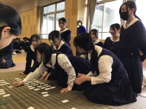 開催 1月 8日(木)始業式後に新春歌かるた大会が行われた。本校では古典に親しんでもらうため、新春の恒例行事としてクラス対抗戦で開催している。 昨年から参加生徒数を増やし、先鋒戦から大将戦までを行う団体戦で行っている。各クラスでメンバー構成や作戦などを入念に練り、選手は一枚でも多くの札を取るため真剣な表情で取り組み、応援の生徒は声援と拍手を贈り、大会は大いに盛り上がった。